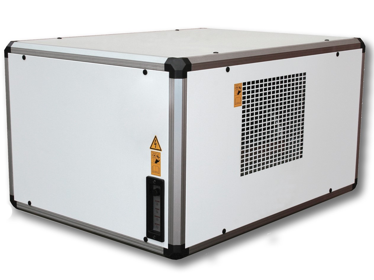 Este deshumidificador tiene una alta resistencia ante los agentes atmosféricos gracias a su estructura de chapa galvanizada recubierta con polvos de poliuretano y a su bandeja de recogida de condensados de acero inoxidable.